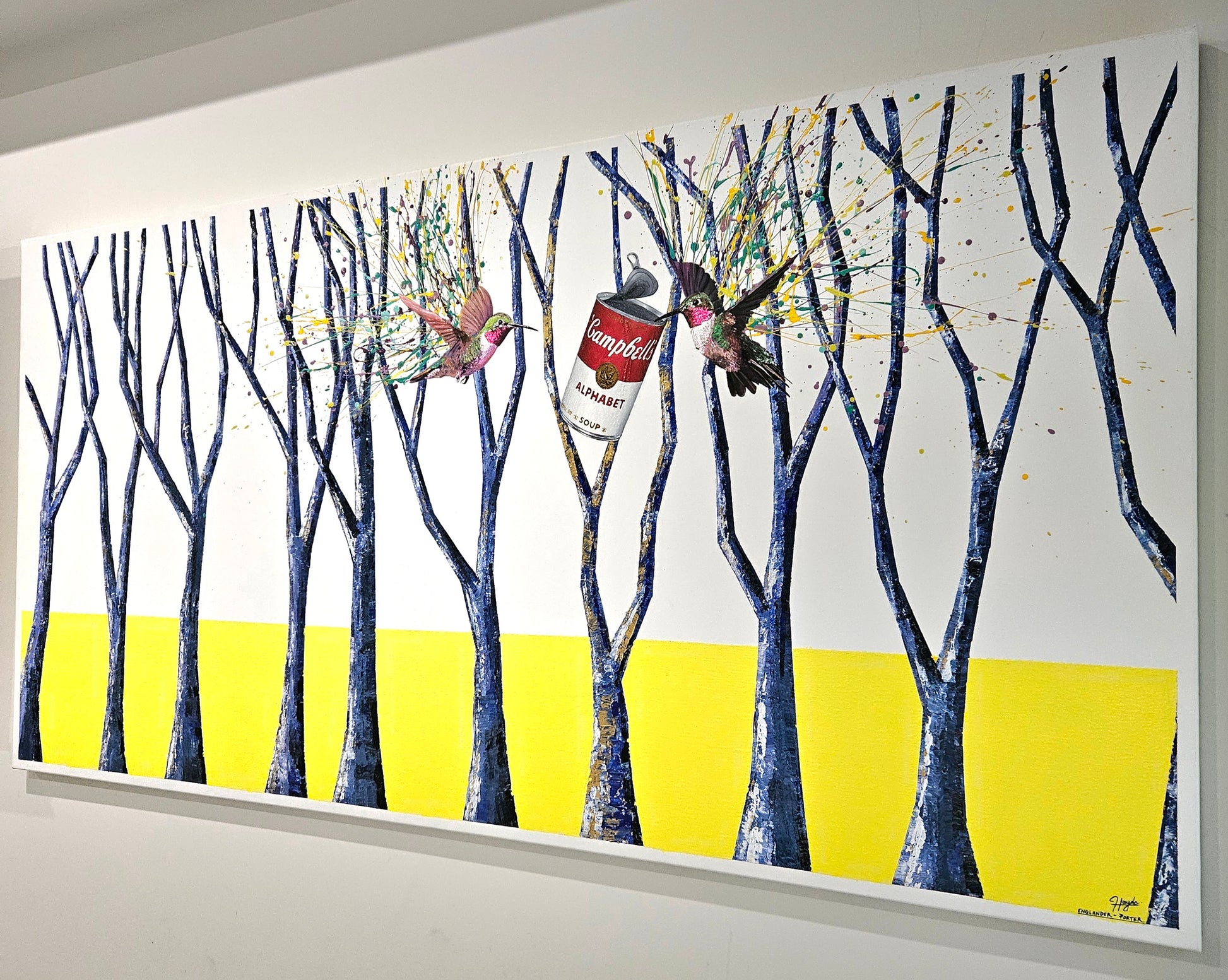 This work sits at the intersection of pop art and contemporary figurative painting, playful yet reflective, accessible yet layered. Hummingbirds invites the viewer to question the relationship between nature, nourishment and modern life, making it a compelling statement piece with both visual impact and conceptual depth. A beautiful addition to add to the art collection. 202cm Length x 101cm Height