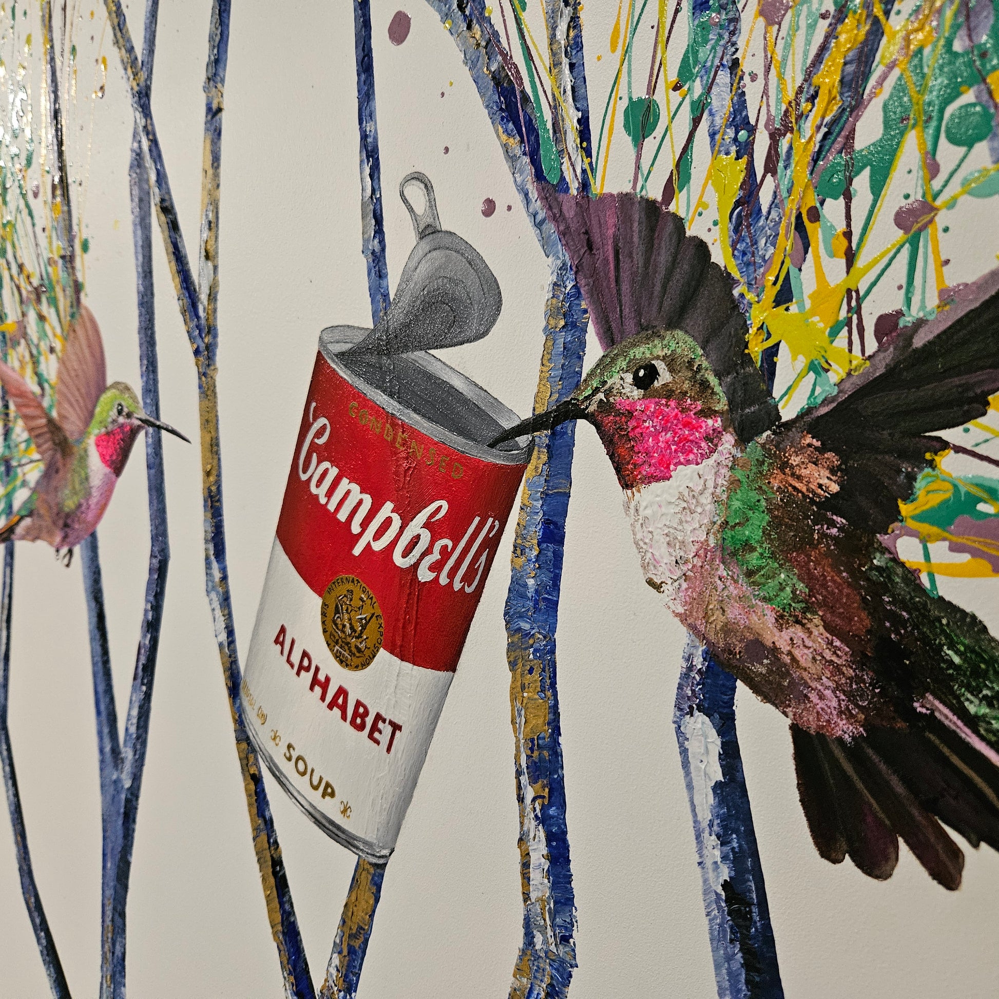 The hummingbirds, traditionally symbols of vitality, speed and resilience, are recontextualised here, drawn not to flowers, but to manufactured sustenance. The Alphabet Soup can becomes a quiet metaphor for language, learning and consumption: what we are fed, what we absorb, and how meaning is formed in a modern world saturated with symbols.