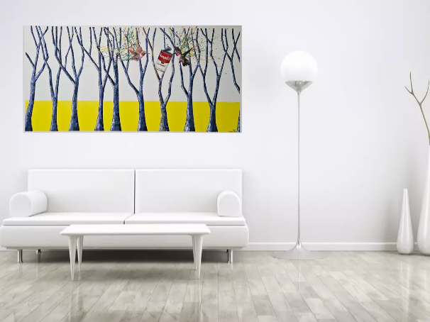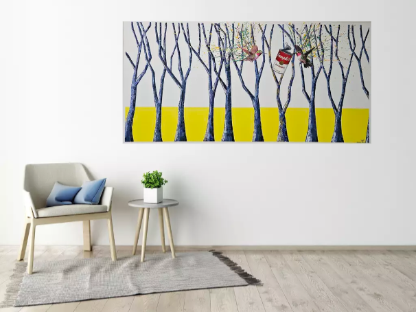 A repeating forest of slender, blue-toned trees creates rhythm and structure, contrasting with explosive splashes of colour radiating from the birds’ wings. Beneath it all, a bold band of yellow anchors the composition, injecting warmth, optimism and tension against the cool verticals above.